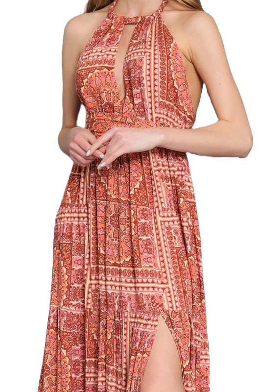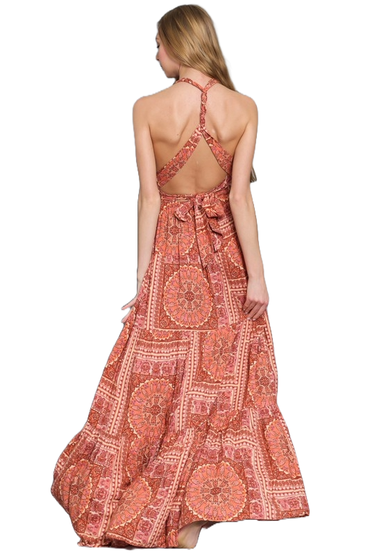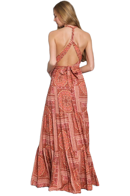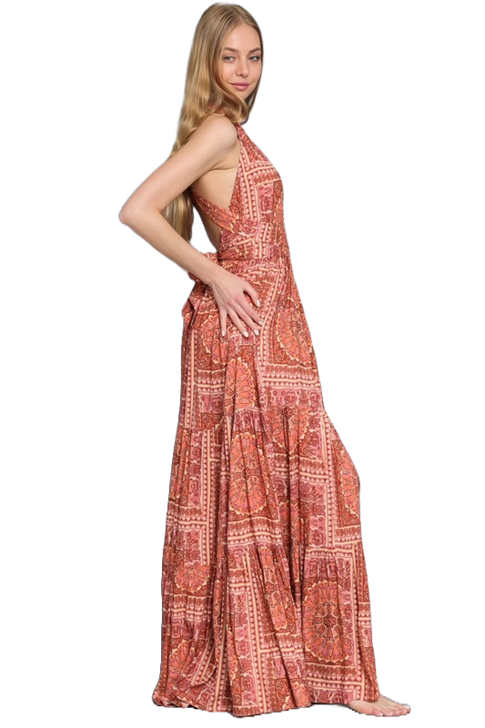 A terracotta twist‑tie tiered maxi dress with a deep V neckline, adjustable back ties, and a flowing bohemian silhouette.