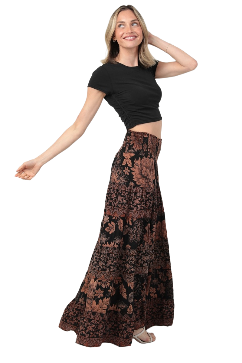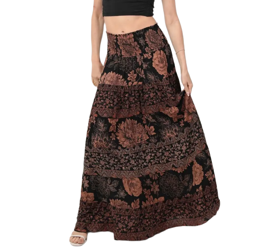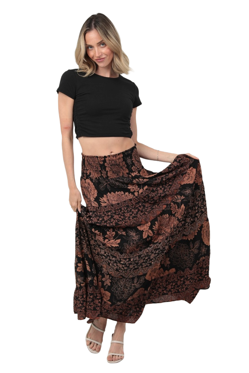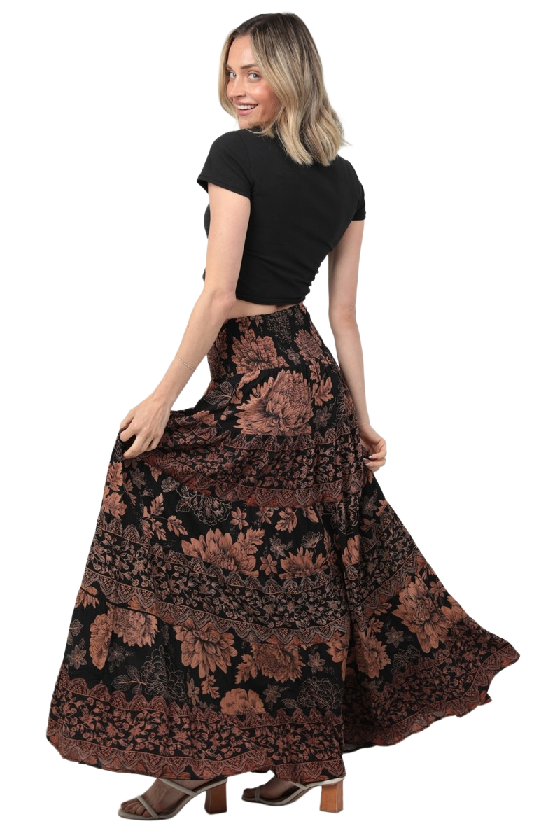 A flowing black and brown tiered maxi skirt in a floral desert‑noir palette, crafted from 100% rayon.