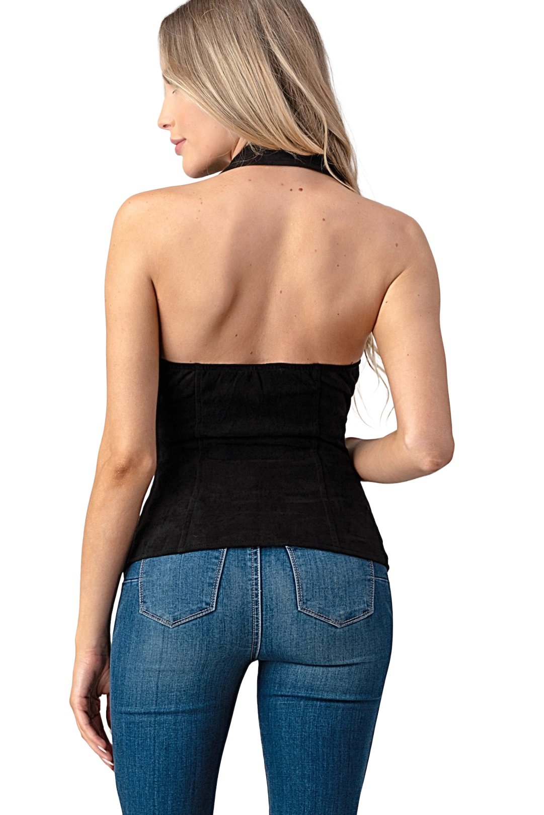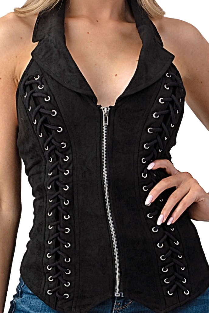 A sculpted halter vest with lace‑up sides and a bold front zipper. Faux‑suede stretch blend • Modern, edgy silhouette • Wear it with denim or layered looks.