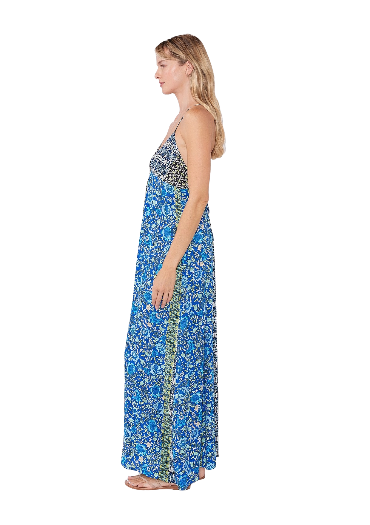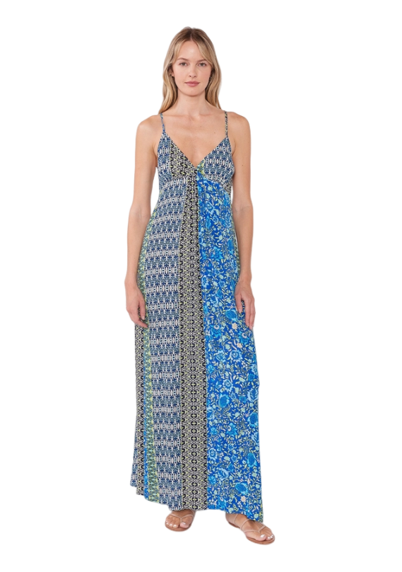 A blue mixed‑print metallic halter maxi dress with shimmering gold threads, a deep V neckline, adjustable strappy back, empire waist, and side pockets.
