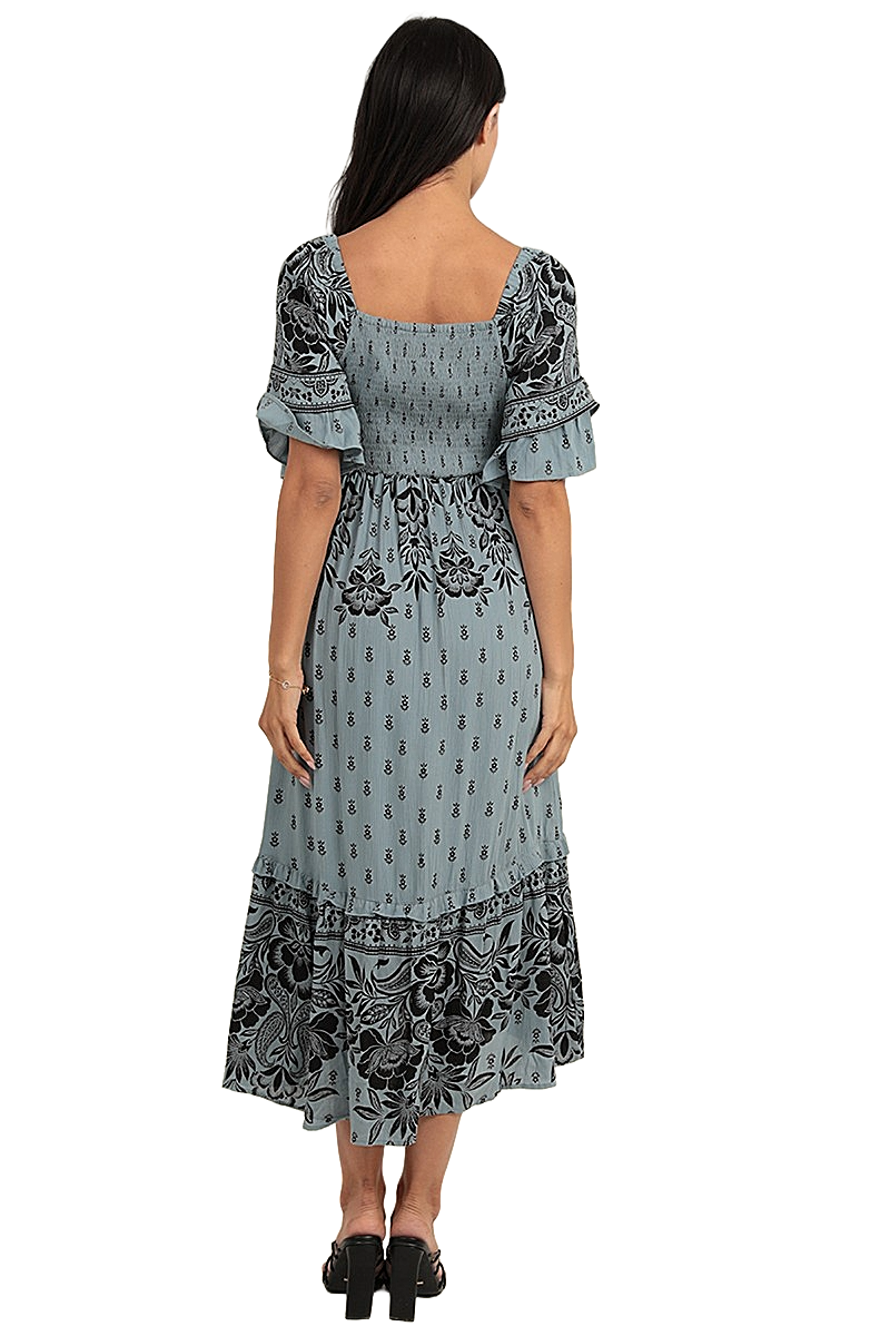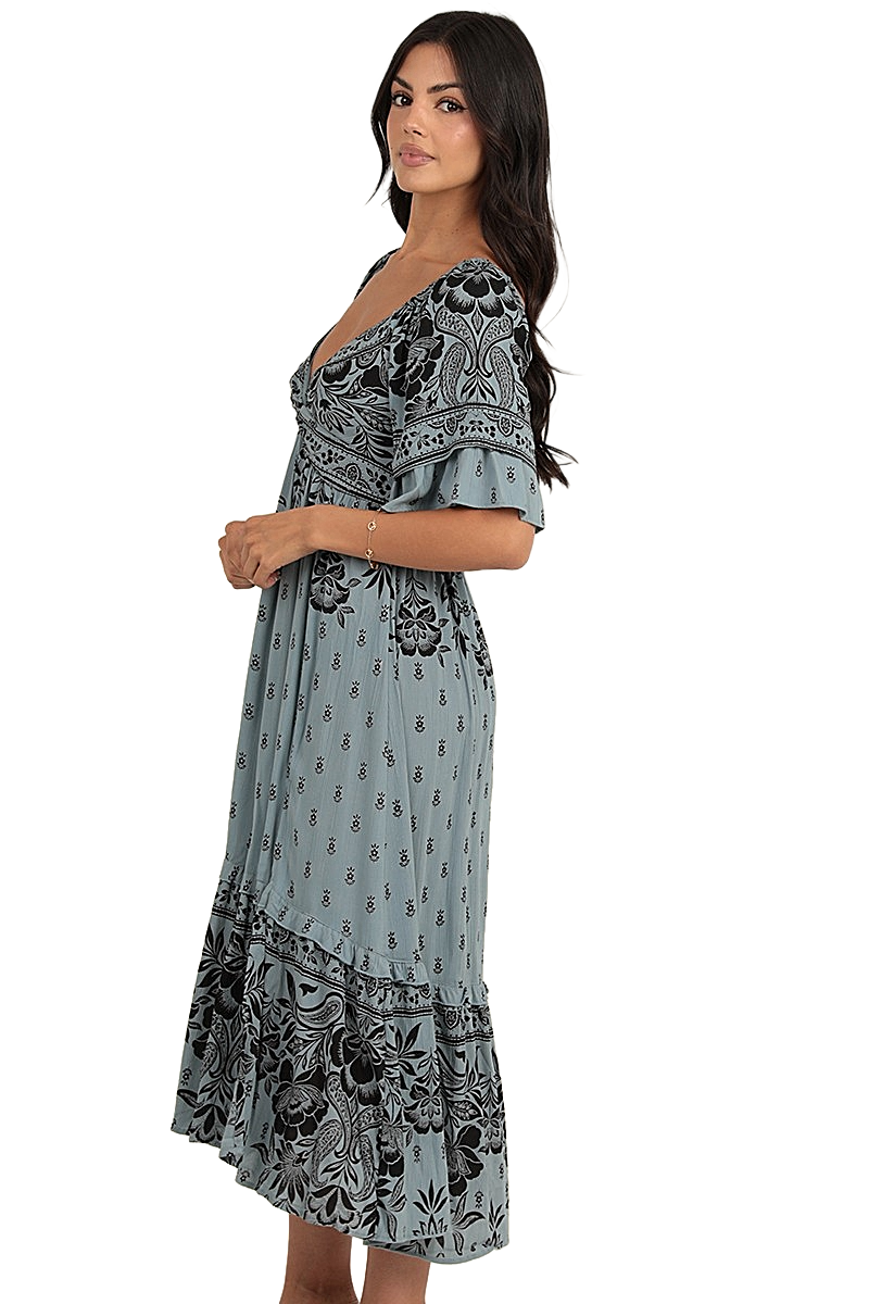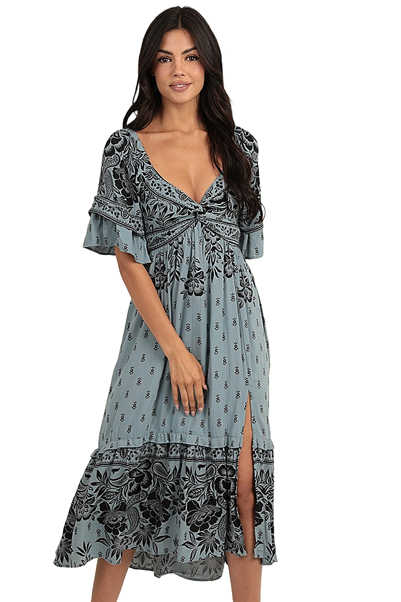 Find your flow in a piece designed for effortless grace. This Angie midi dress is a masterclass in bohemian contrast, pairing a serene dusty blue canvas with intricate black floral and henna motifs. The architectural twist-front bodice, complete with a delicate front cutout, creates a sculptural focal point, while the voluminous flared sleeves and front-slit ruffled skirt offer dramatic breathability. Crafted from 100% rayon, it is an airy, soulful garment for the woman who finds her magic in the quiet beauty of a twilight sky.