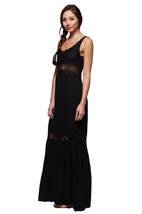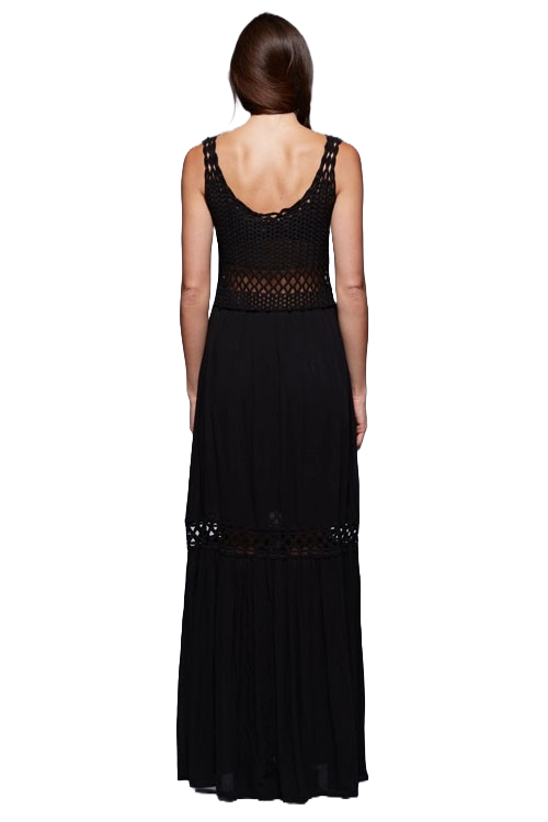 A black gauze maxi dress with intricate cotton crochet panels, a flowing tiered skirt, and a silhouette that blends softness, shadow, and artisanal texture.