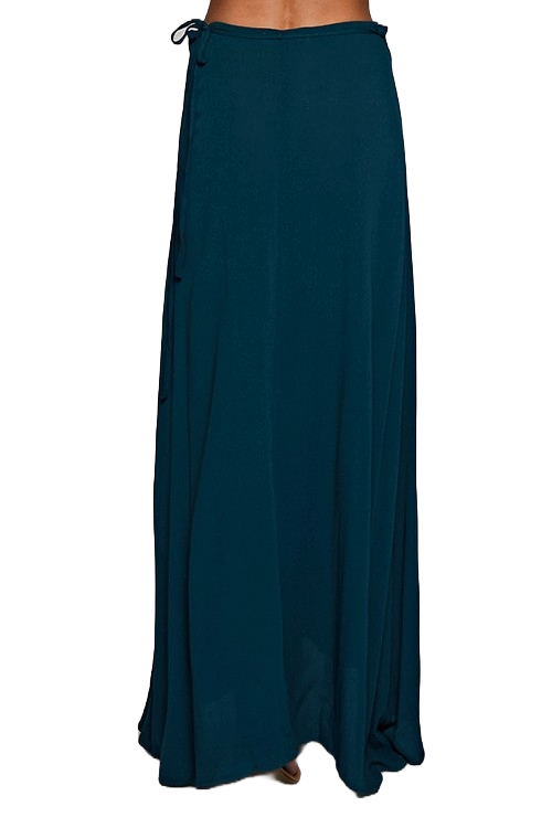 A deep peacock‑blue wrap maxi skirt with a fluid drape, adjustable tie waist, and lightweight 100% rayon construction.