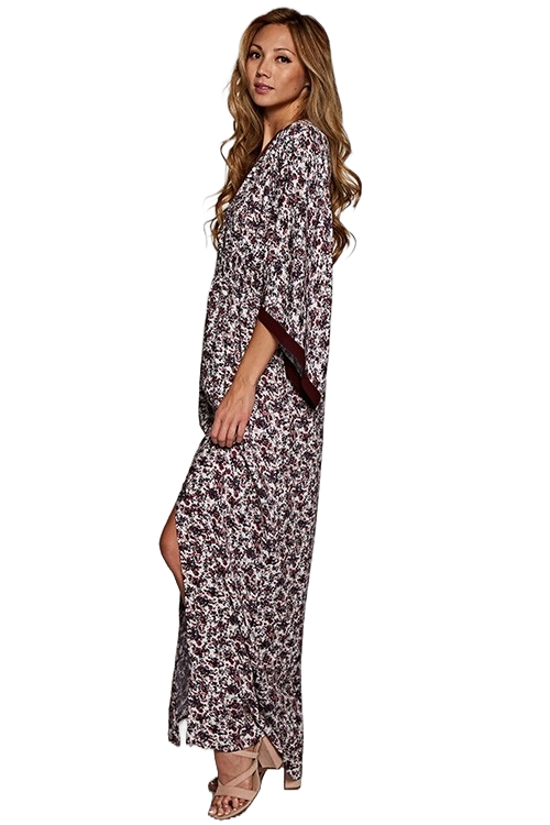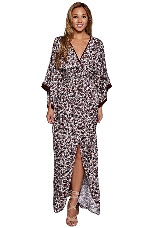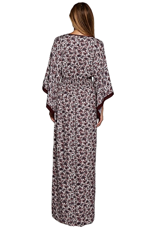 A plum and rose floral kimono‑sleeve maxi dress with a smocked waist, deep V neckline, front slit, and flowing bohemian silhouette.