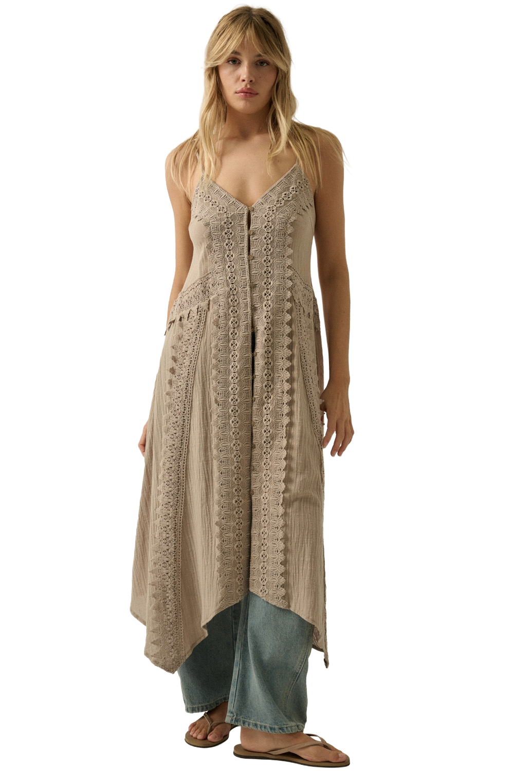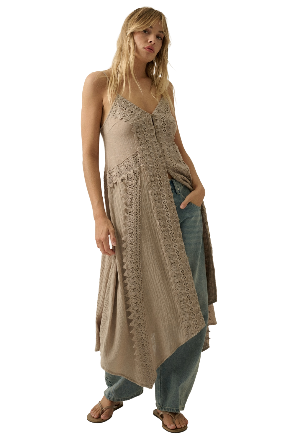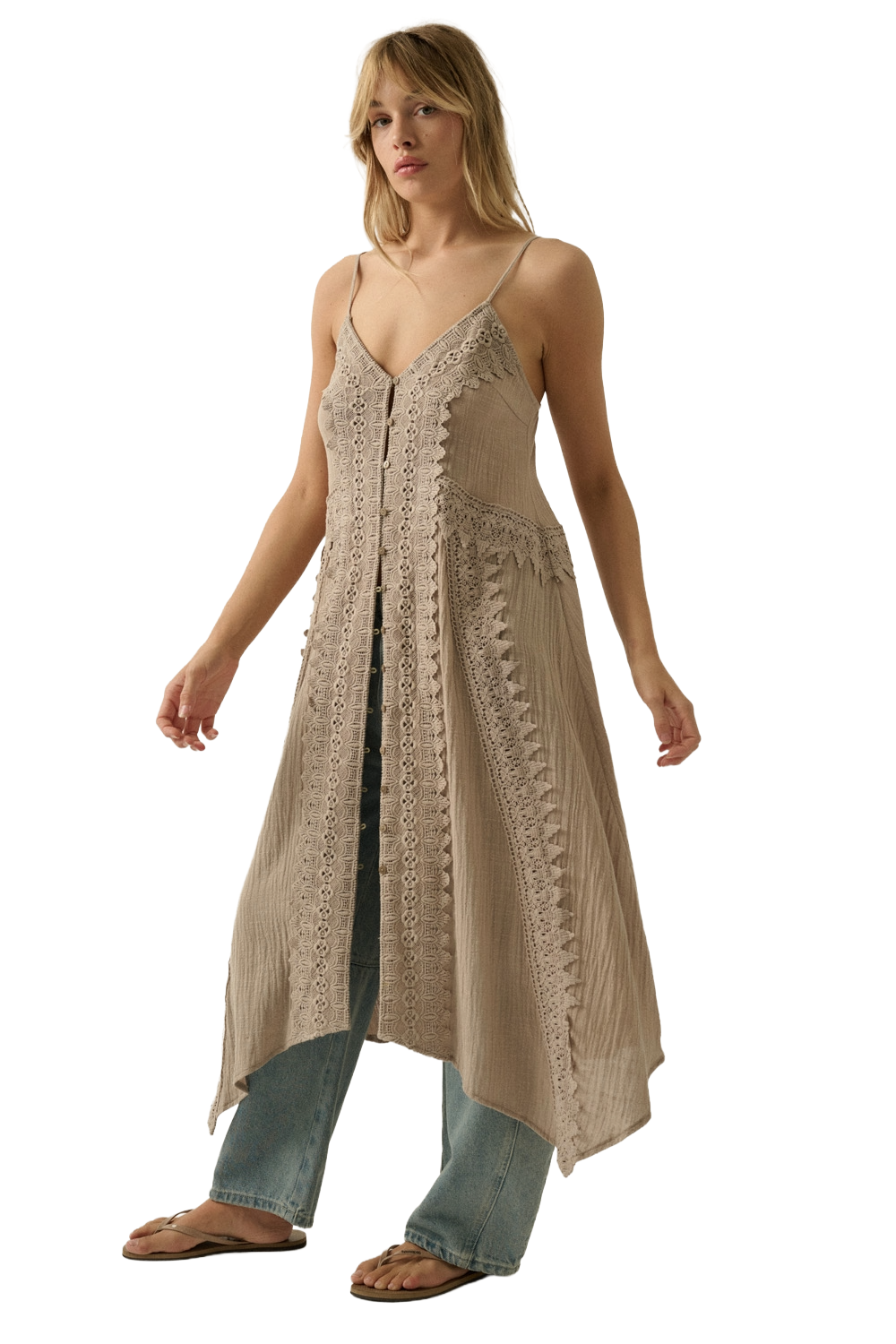 A soft cotton‑gauze cami maxi top featuring lace‑trimmed panels, a button‑front bodice, and a flowing, bohemian silhouette.