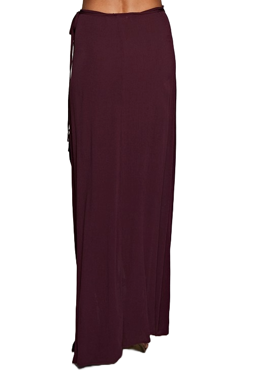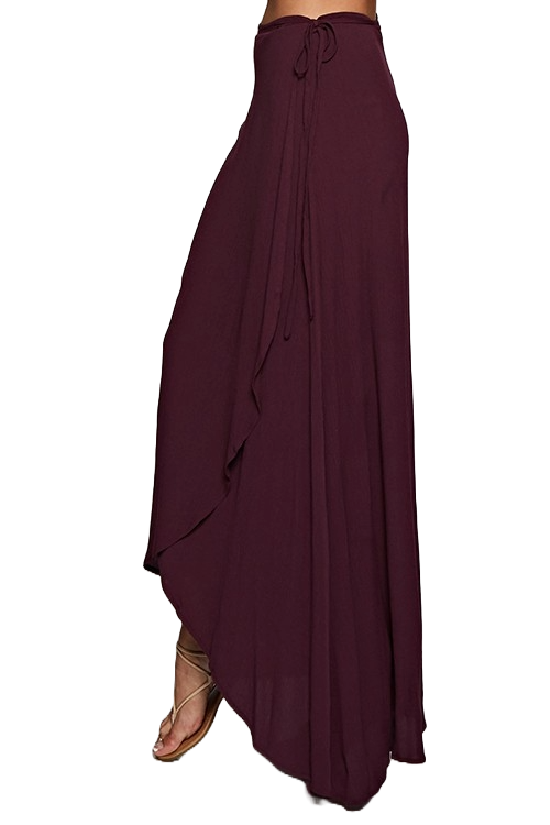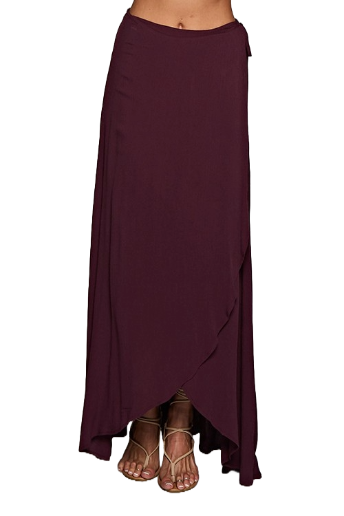 A grape‑purple wrap maxi skirt with a flowing silhouette, adjustable tie waist, and soft, breathable rayon drape.