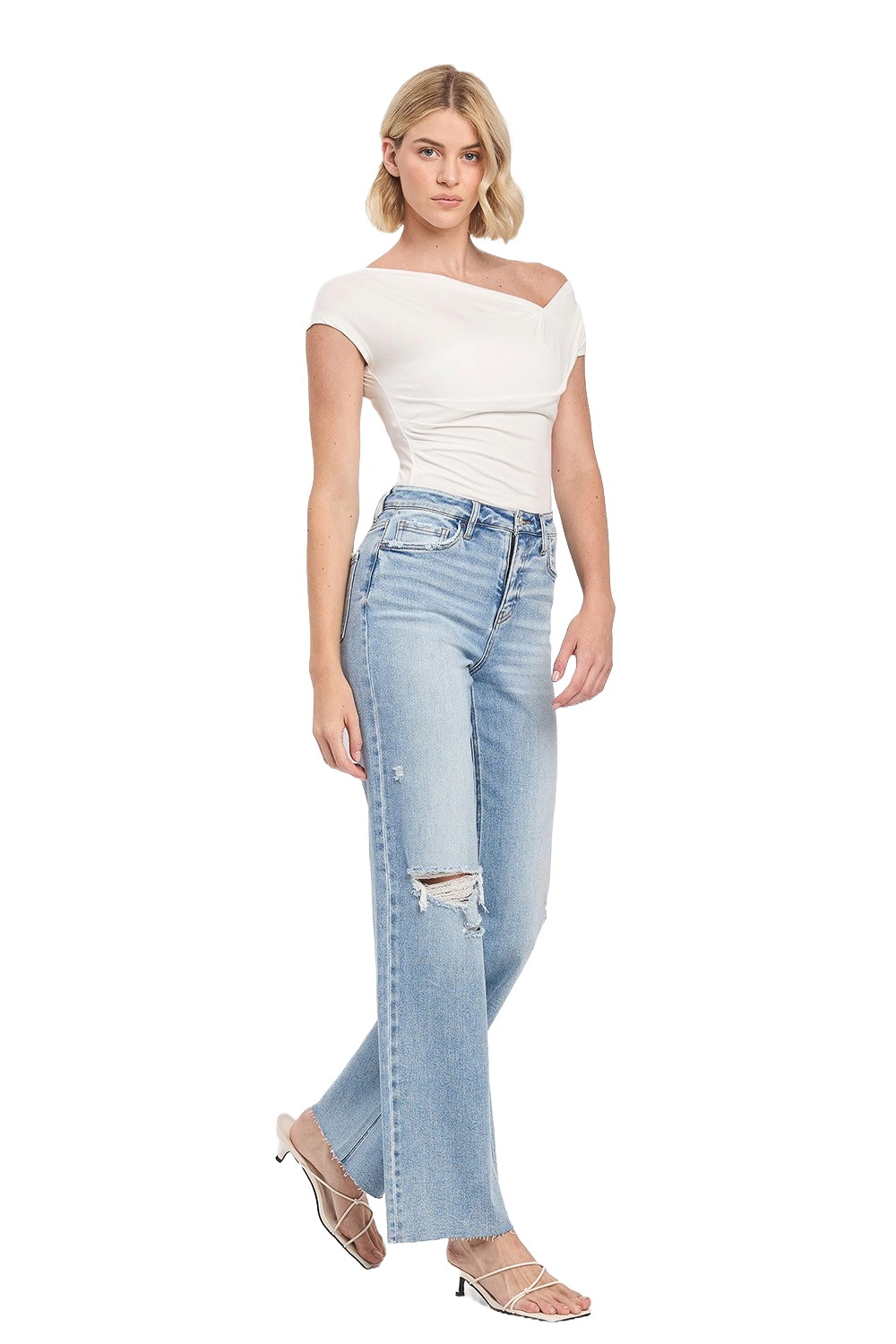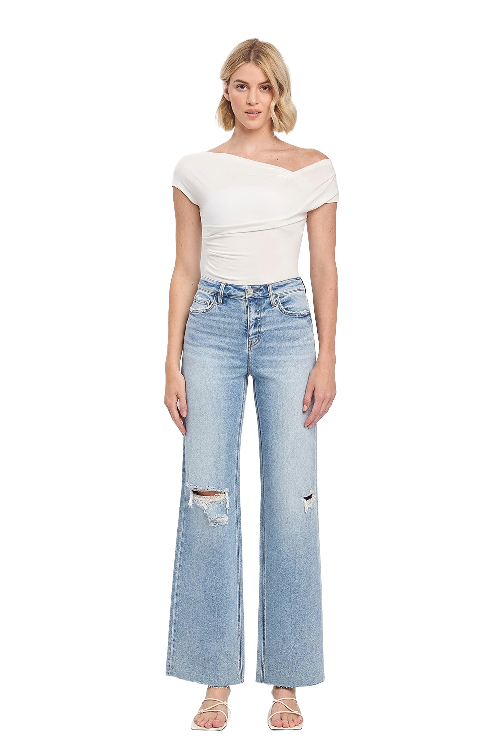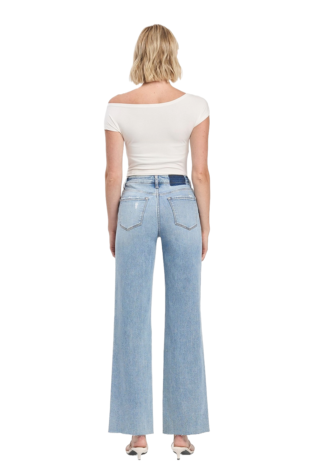 Light‑wash high‑rise wide‑leg jeans with a soft vintage feel — airy, elongating, and effortlessly modern.