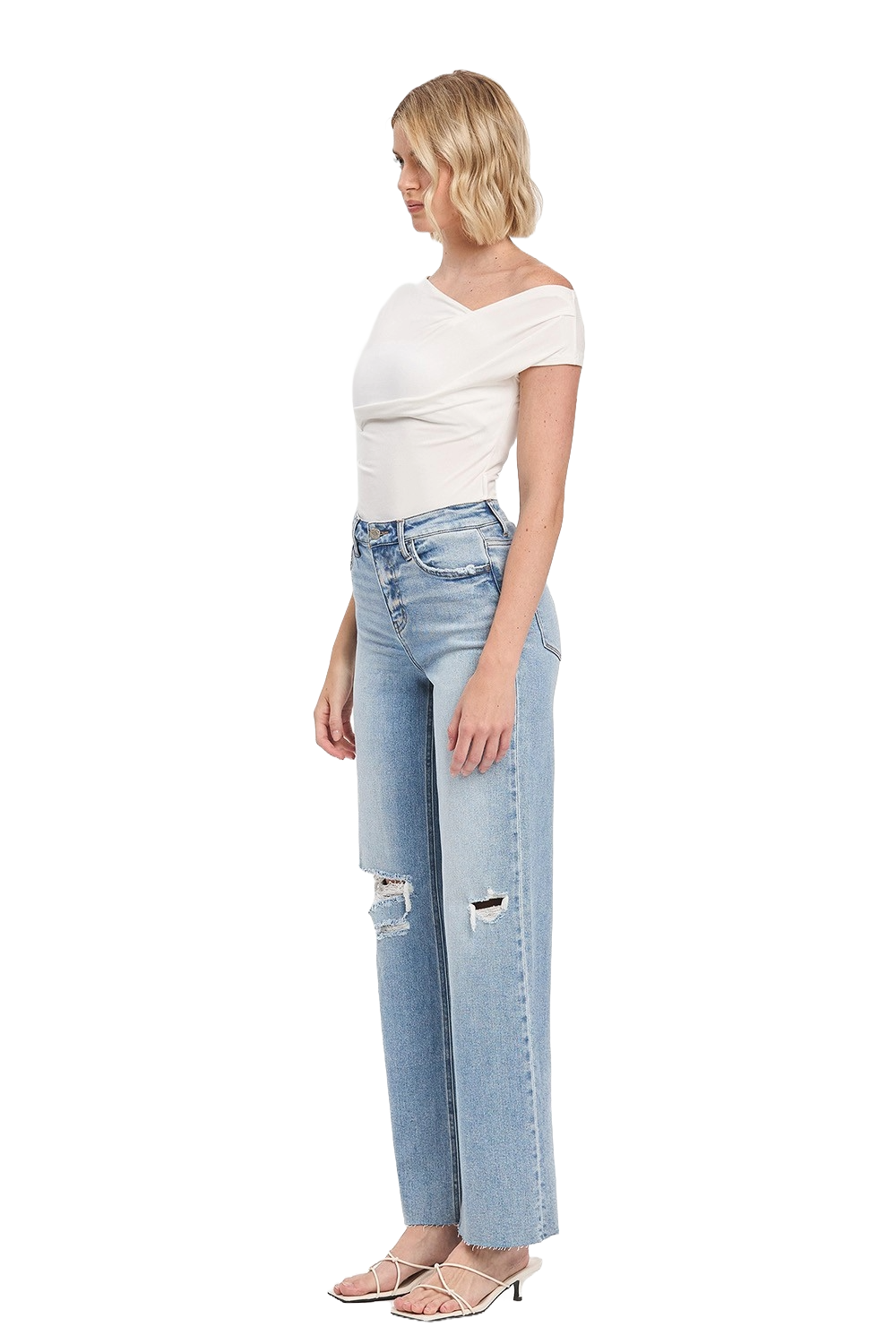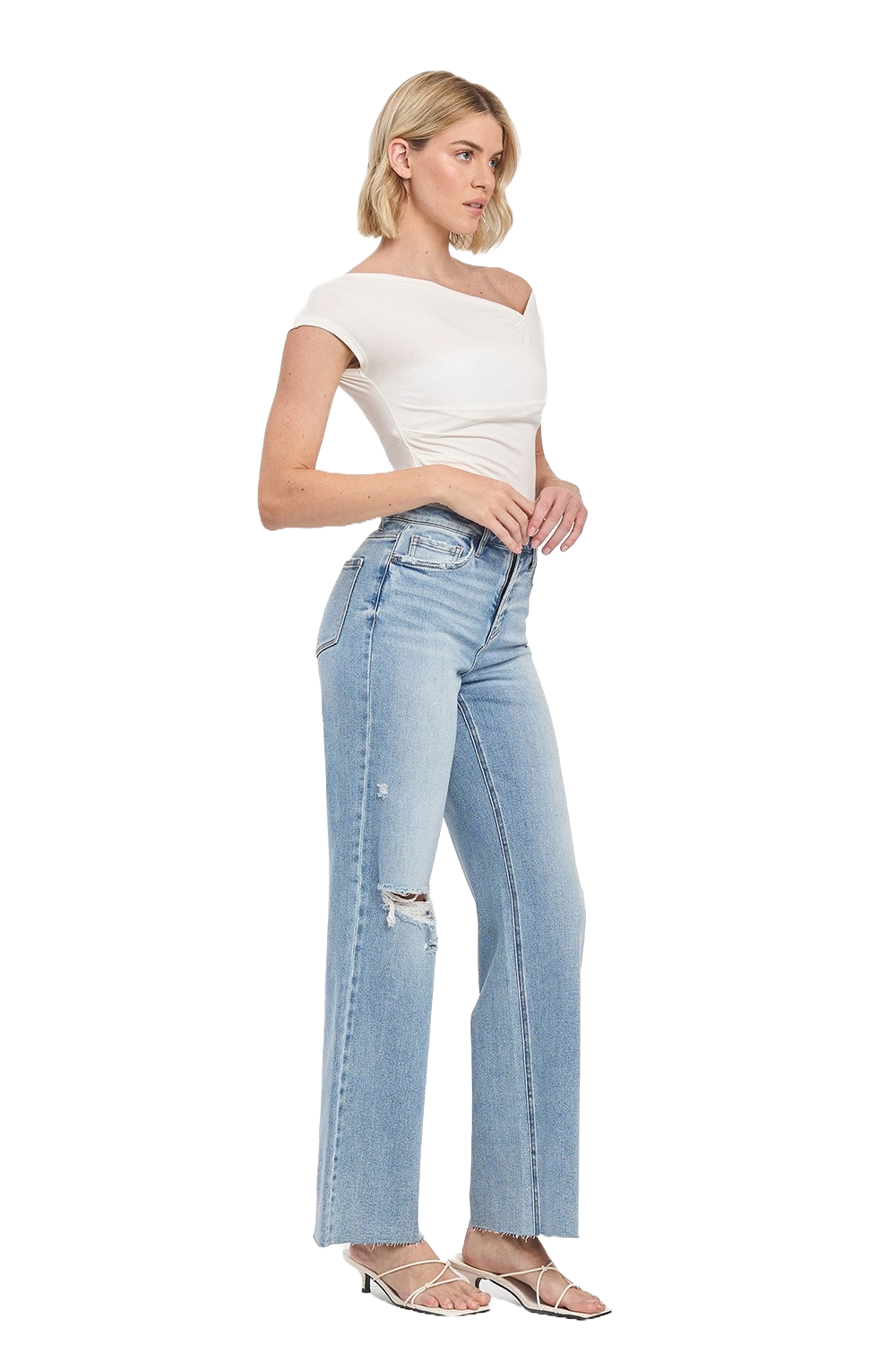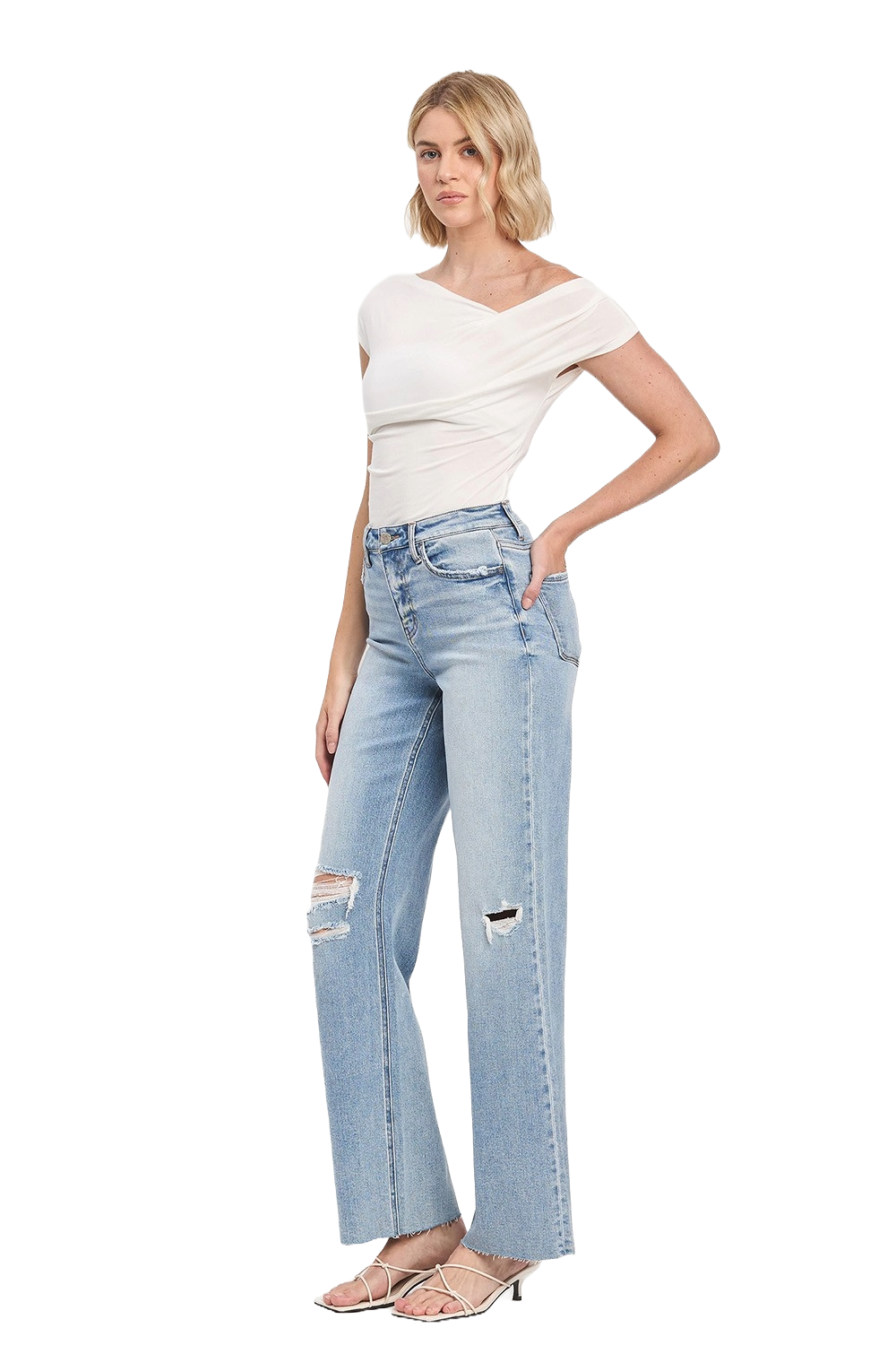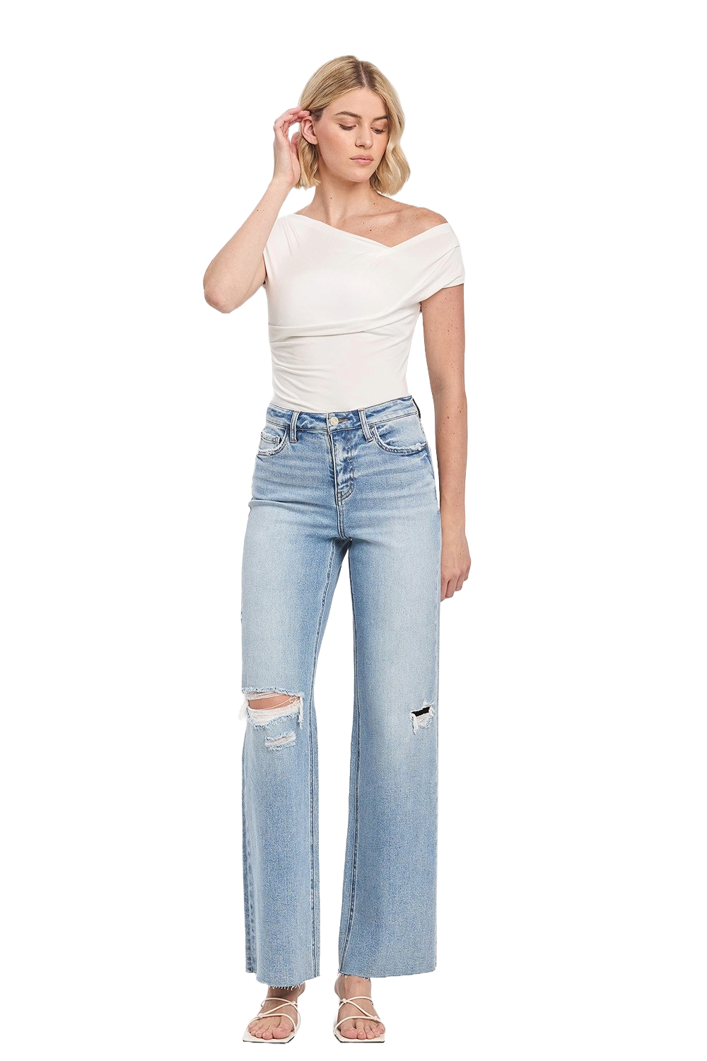 Light‑wash high‑rise wide‑leg jeans with a soft vintage feel — airy, elongating, and effortlessly modern.